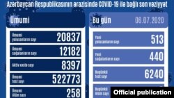 İyulun 6-da Azərbaycanda koronavirus (COVID-19) infeksiyasına 513 yeni yoluxma faktı qeydə alınıb, 440 nəfər müalicə olunaraq sağalıb və evə buraxılıb.