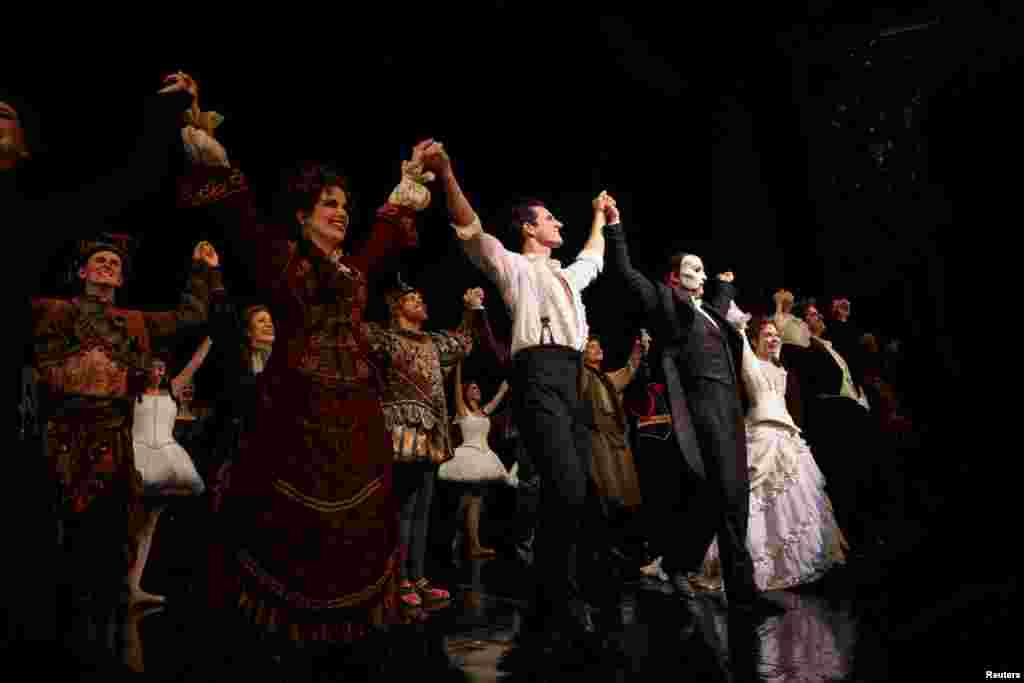 Nyu York - Majestic Teatrının aktyorları “Opera Kabusu” tamaşasının yenidən açılış gecəsində çıxış etdikdən sonra səhnəyə çıxıblar.