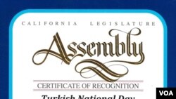 Kaliforniya ştatının parlamenti Türk-Amerika Assosiasiyalarının (ATAA) tanınmasına dair rəsmi sənəd açıqlayıb. Sənəddə aprelin 23-ü Türkiyənin Milli Günü münasibətilə ştatın parlamenti adından rəsmi təbrik də çatdırılır.
