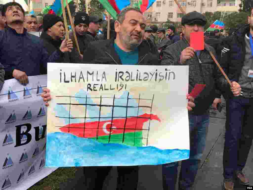 Milli Şura və Müsavat Partiyası birgə aksiyada “Talana son!”, “Monarxiyaya son!” və "Siyasi məhbuslara azadlıq"” kimi şüarlar səsləndirib. Miotinq iştirakçıları prezident seçkilərinin nəticələrinin ləğv edilməsini tələb edib.