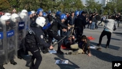 Ankarada polis bazar ertəsi müasir Türkiyə tarixində ən dəhşətli terror hücumunun ildönümünü qeyd etmək üçün toplaşan yüzlərlə fəala qarşı gözyaşardıcı qaz və təyziqli sudan istifadə edib.